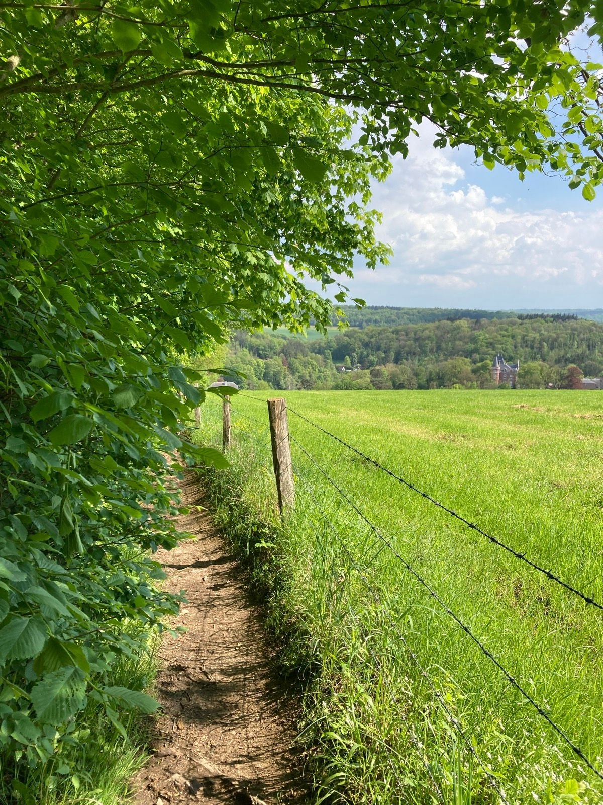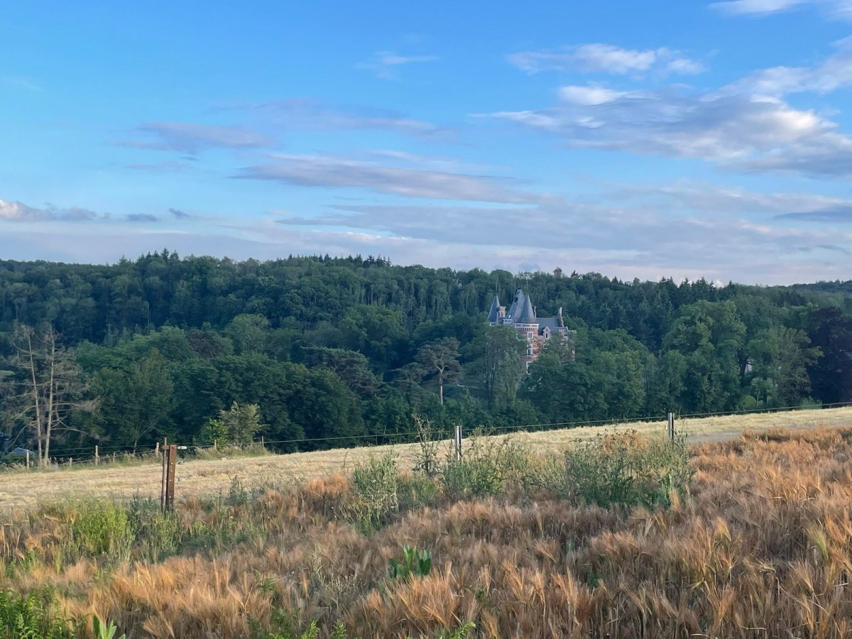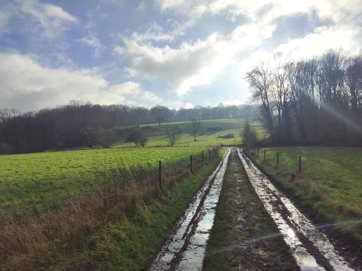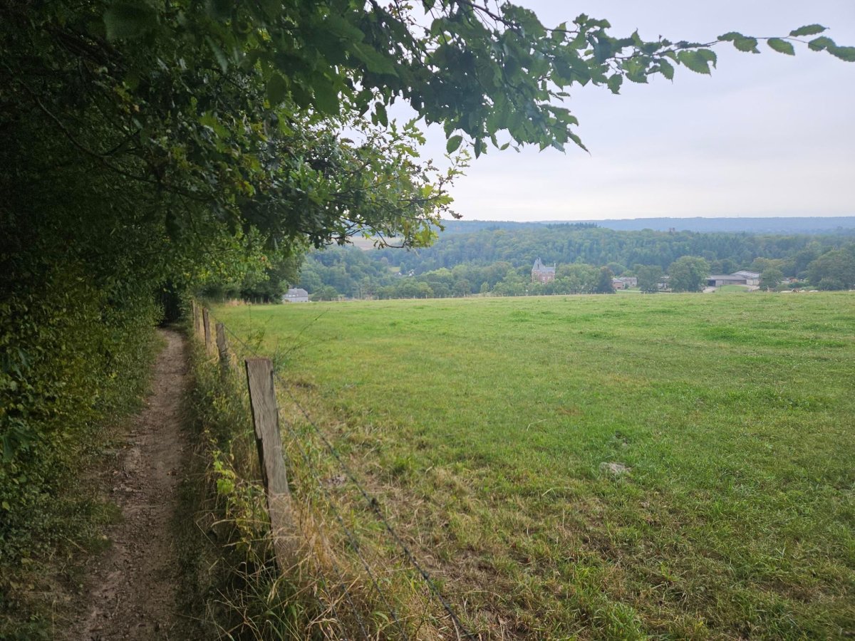 La montée ouvre progressivement la vue sur les campagnes du Condroz, avec leurs ondulations typiques et leurs haies bocagères.