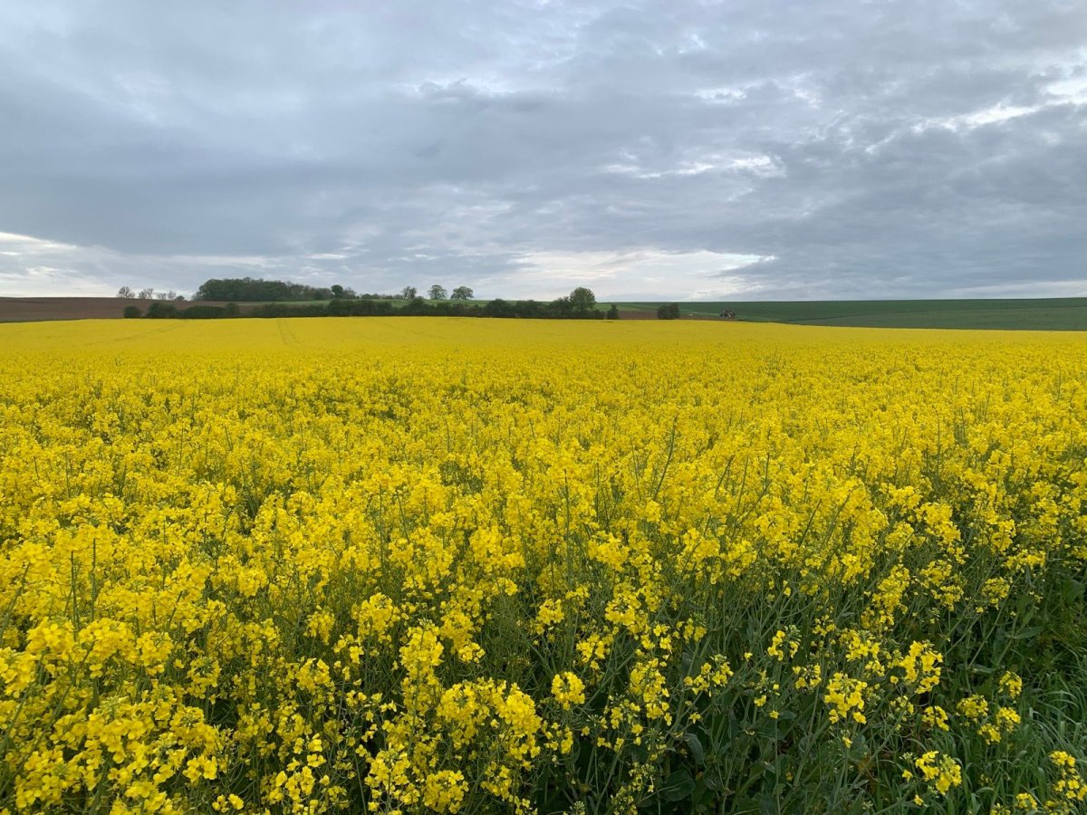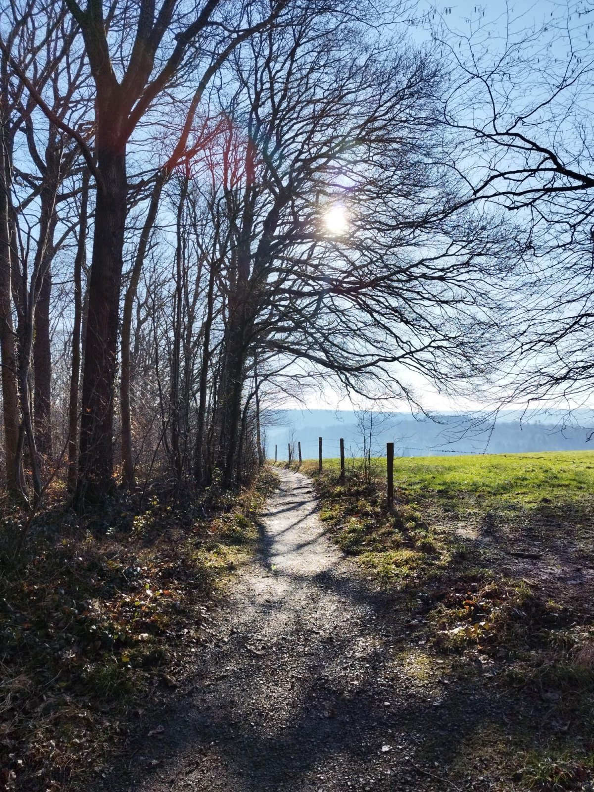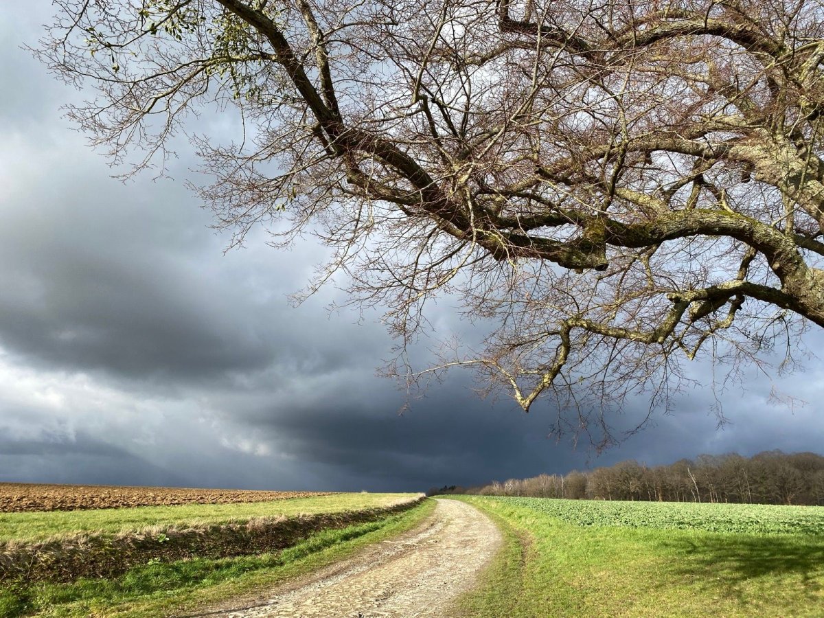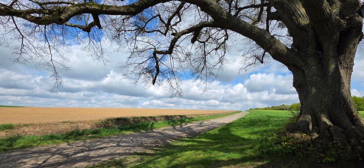 La montée ouvre progressivement la vue sur les campagnes du Condroz, avec leurs ondulations typiques et leurs haies bocagères.