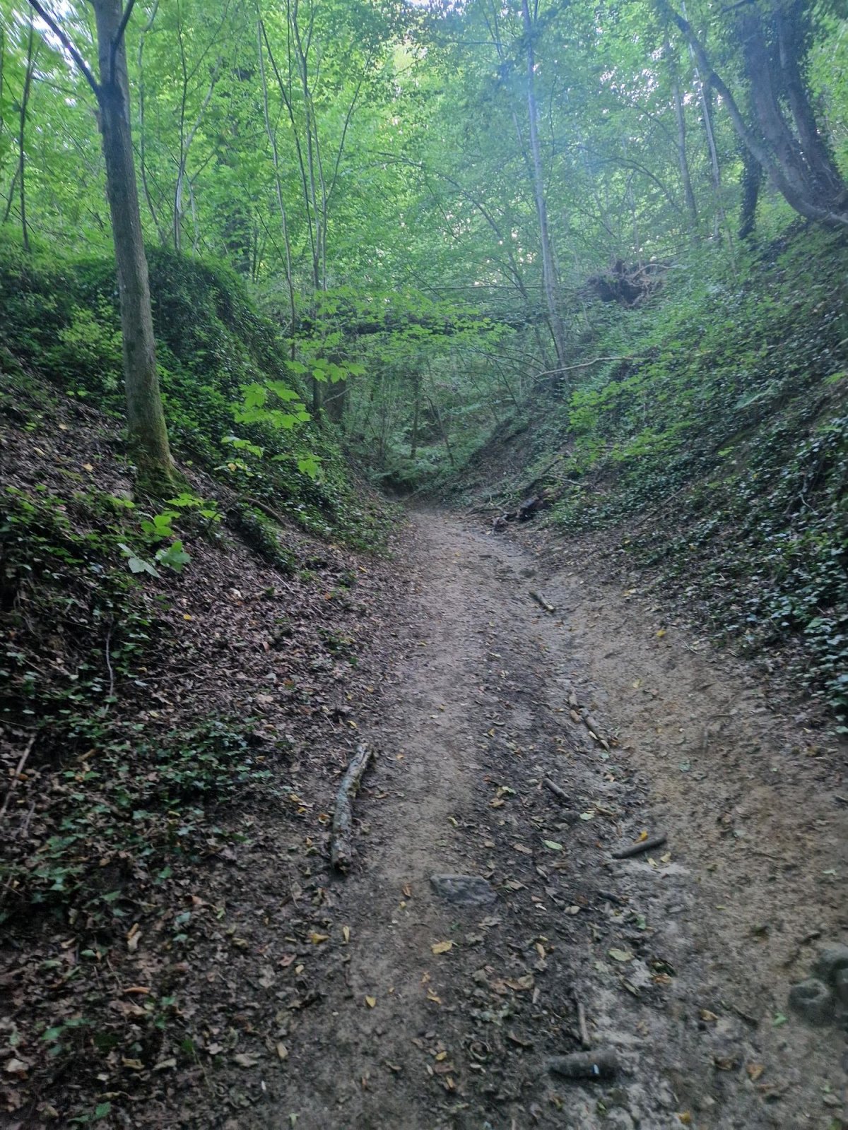 La descente ramène vers des zones boisées où l’ombre des hêtres et des chênes crée une ambiance plus intime.